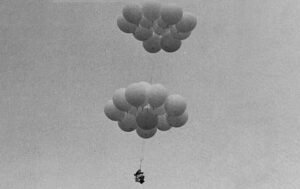 Ông mang các thứ đó ra sân sau nhà của ông. Ông cột các bong bóng đó vào ghế ngồi ngoài sân của ông và ông cột cái ghế đó vào chiếc xe của ông. Và bôm đầy các quả bong bóng bằng hơi helium. Ông chuẩn bị mấy miếng sandwich, mấy chai nước uống và một cây súng loại BB với mục đích để bắn xì hơi vài cái bong bóng một khi ông muốn hạ đáp xuống đất.